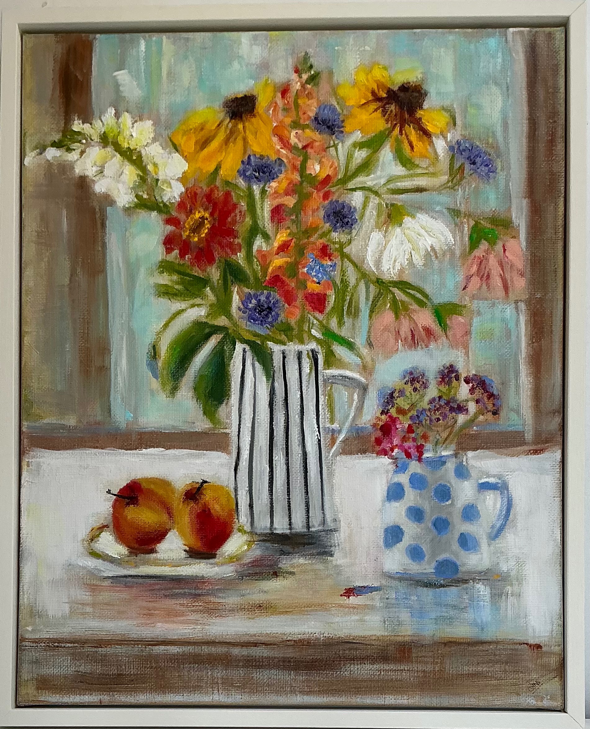 Blue jug with flowers Oil on Dutch Linen SOLD